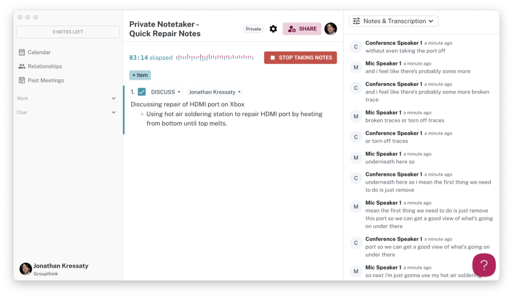 When discretion matters, Groupthink’s private mode captures everything through your desktop, no visible bot, no announcement, no awkward explanations. Perfect for: